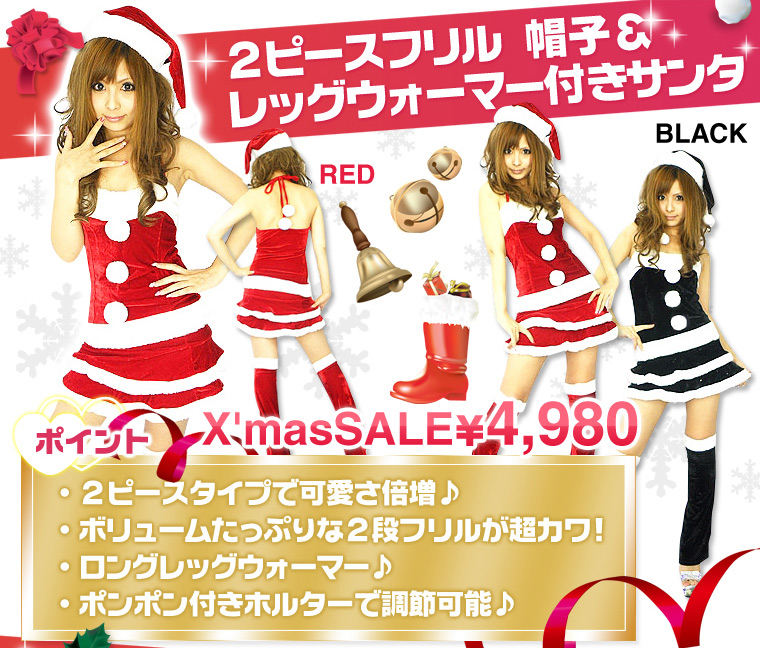2ピースフリルで、これぞ可愛いサンタさん。ロングレッグウォーマー付きで